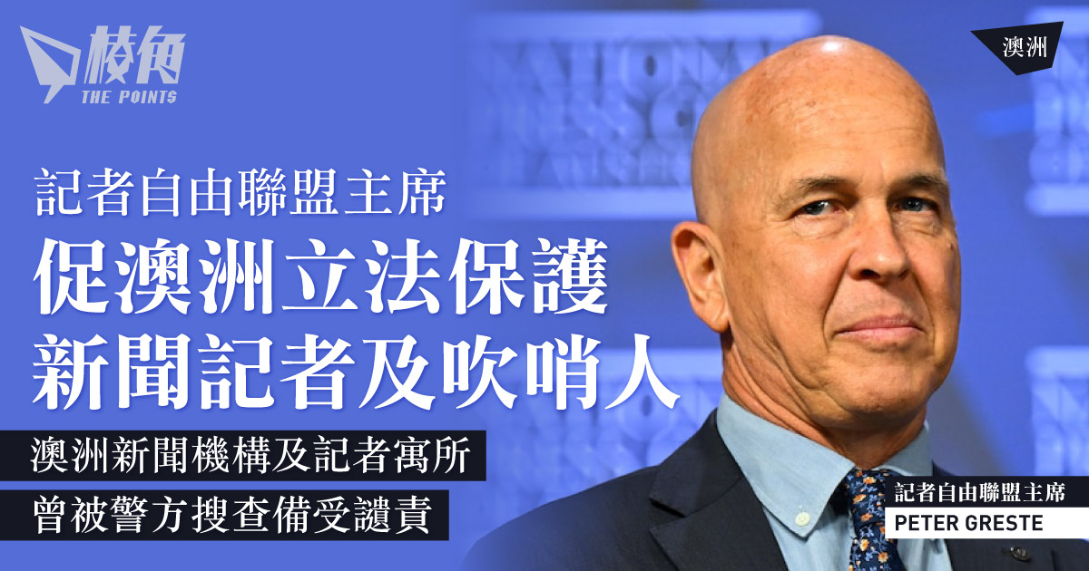 記者自由聯盟主席兼發言人格雷斯特(Peter Greste)日前在坎培拉國家新聞俱樂部發表講話,呼籲澳洲政府制定《媒體自由法案》,並加強對新聞工作者及吹哨人的保護,保障澳洲的新聞自由。