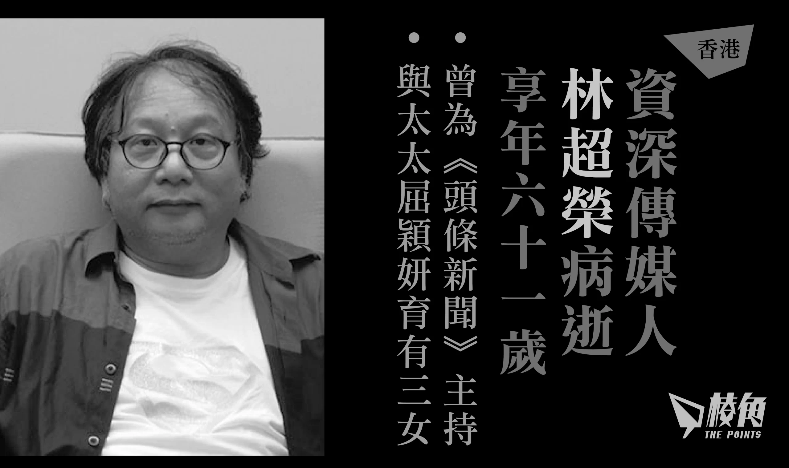 有「超人」之稱的資深傳媒人林超榮病逝,享年61歲。他的好友作家沈西城周二(12日)在社交平台公佈死訊,「好友超人林超榮離世!哀悼!」林超榮是香港著名主持人及傳媒人,亦參與電視及電影編劇及創作人,最廣為大眾熟悉的可數時事節目《頭條新聞》中的「頭條超人」。