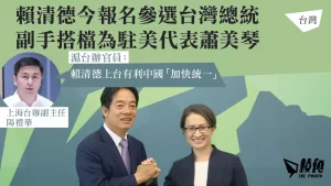 來屆台灣大選參選人登記周一(11月20日)展開,台灣副總統賴清德正式報名代表民進黨參加2024年總統大選,並公佈其競選搭檔、副總統候選人為台灣駐美代表蕭美琴。賴清德盛讚蕭美琴「這幾年在美國的外交表現,早已被民眾與國際友人們稱讚,絕對是現今台灣外交工作中的佼佼者」,更形容「這是眾所期待的決定,也是最好的決定」。
