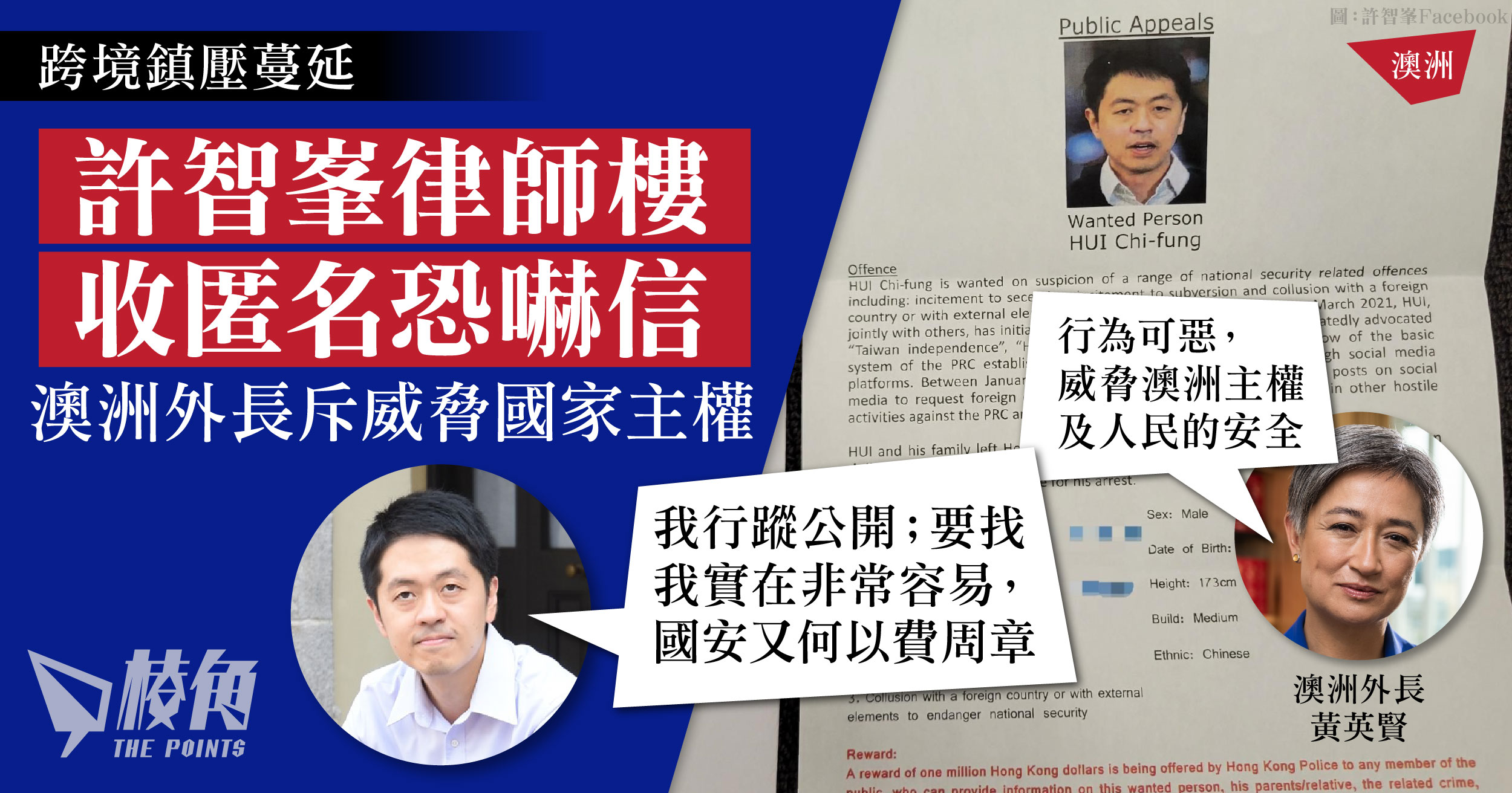 陸續有被港府國安處懸紅通緝的海外港人受跨境鎮壓威脅。前立法院議員,現居澳洲的執業律師許智峯周二(25日)在社交媒體上載一封其律師樓收到的一封匿名信,信中訛稱許智峯有300萬澳元「犯罪得益」,鼓勵收信人舉報或將自己「交給」香港或澳洲聯邦警察以獲得懸紅獎金。澳洲外長黃英賢(Penny Wong)回應傳媒,形容行為「可惡」(reprehensible),同時威脅澳洲主權及人民的安全。