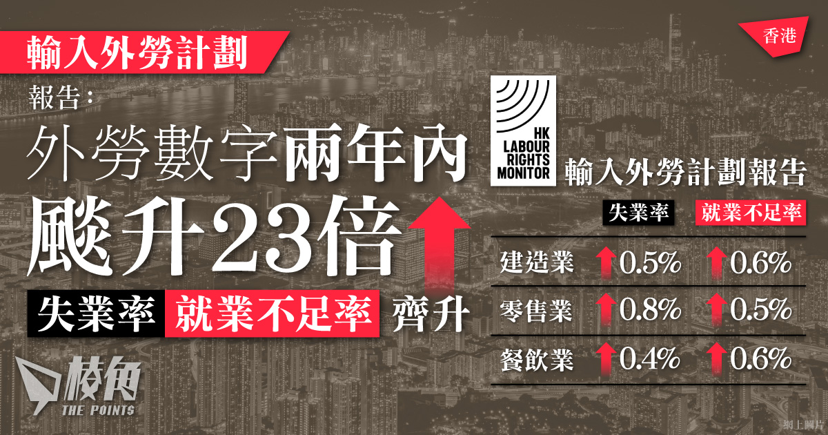 政府於2023年推出分別「行業輸入外勞計劃」及「補充勞工優化計劃」,香港勞權監察周三(26日)發表報告,指計劃至令最少輸入約71,000名外勞,是以往每年平均數字的23倍,當中建築、食飲及零售業的失業率及就業不足率不跌反升,組織促當局停止以上3個行業的輸入勞工計劃,保障本地勞工。
