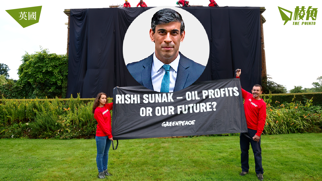 綠色和平在社交平台X(前稱Twitter)上載照片,指他們有成員爬上辛偉誠的住所屋頂,並掛上一匹200米長、石油黑色的布,以抗議英政府「鑽探狂熱」。他們又舉起寫上「Rishi Sunak – Oil profits or our future?(辛偉誠 – 石油利潤還是我們的未來?)」的橫額抗議。