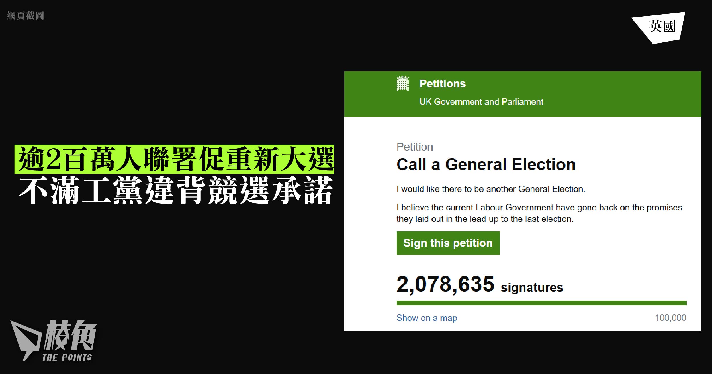 英國工黨上任不足半年爭議聲音不斷,有民眾上月在政府公布財政算案後發起聯署,不滿工黨施政及違背競選承諾,要求重新舉行大選。截至當地時間周一(25日)上午,已獲超過200萬人簽名支持。按規定若聯署超過10萬門檻,國會需要就聯署內容辯論,預計會在本周舉行。