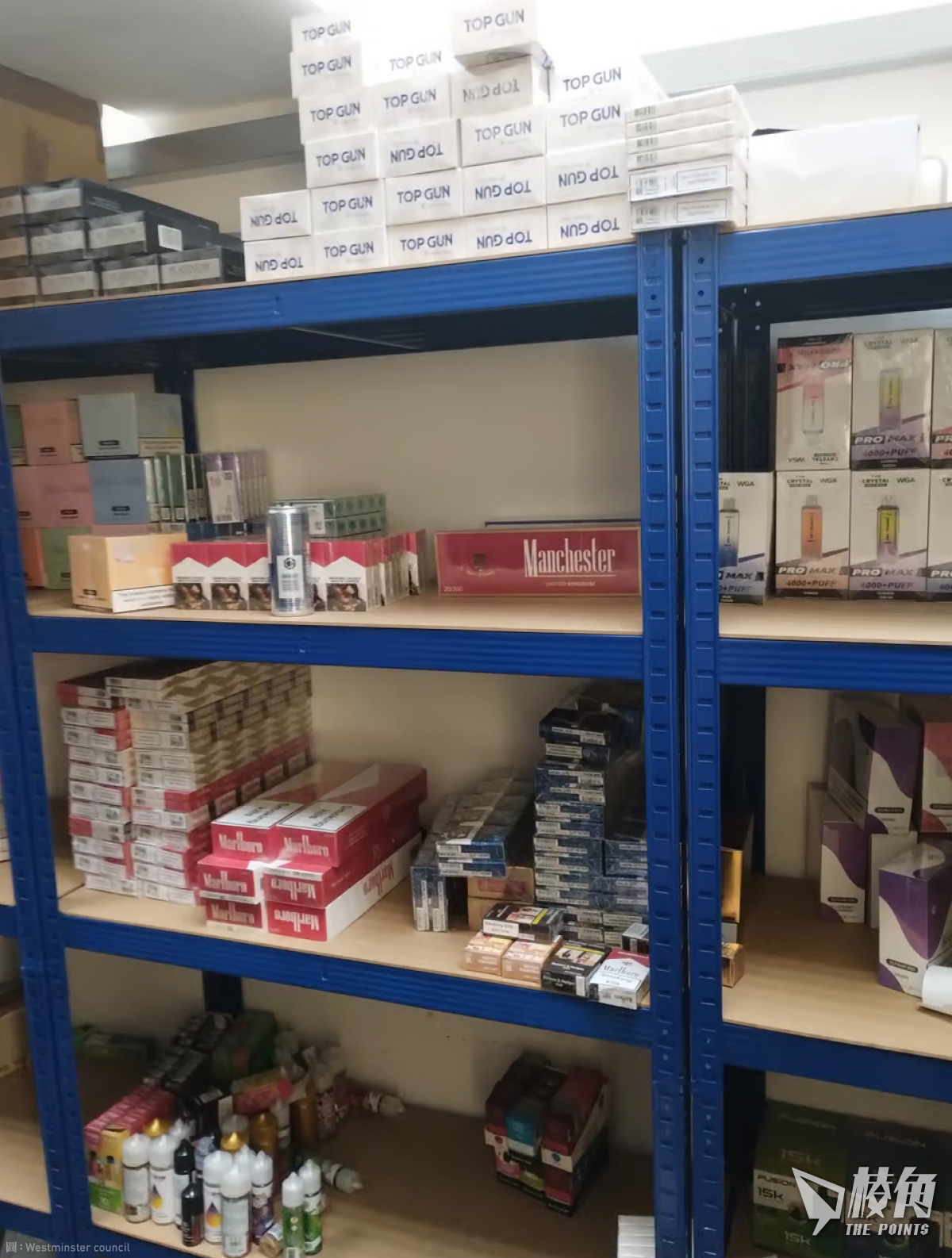 西敏市議會與倫敦警察廳於上月25日展開突襲行動,執法人員在店內發現了一間隱藏房間,裡面藏有大量假冒商品,包括近3,000件美國進口食品、超過30,000支香煙、3182支一次性電子煙、598包尼古丁袋、226件加熱煙草產品,以及61個旅行轉接器和行動電源,總值約80,000英鎊。