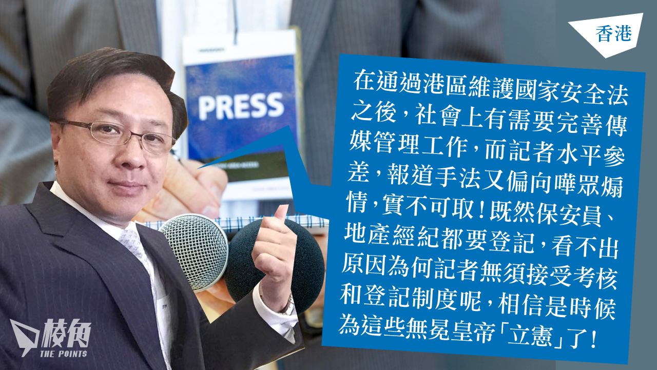 何君堯在文中為自己低表決率「解畫」後,隨即將矛頭指向記者,指報道暗示議員偷懶是有心「帶風向」,目的是貶低完善選擧制度後的立法會。何又指記者「水平參差及嘩眾煽情」,不受牌照及登記制度監管,猶如「無冕皇帝」,呼籲以「立憲」管制。