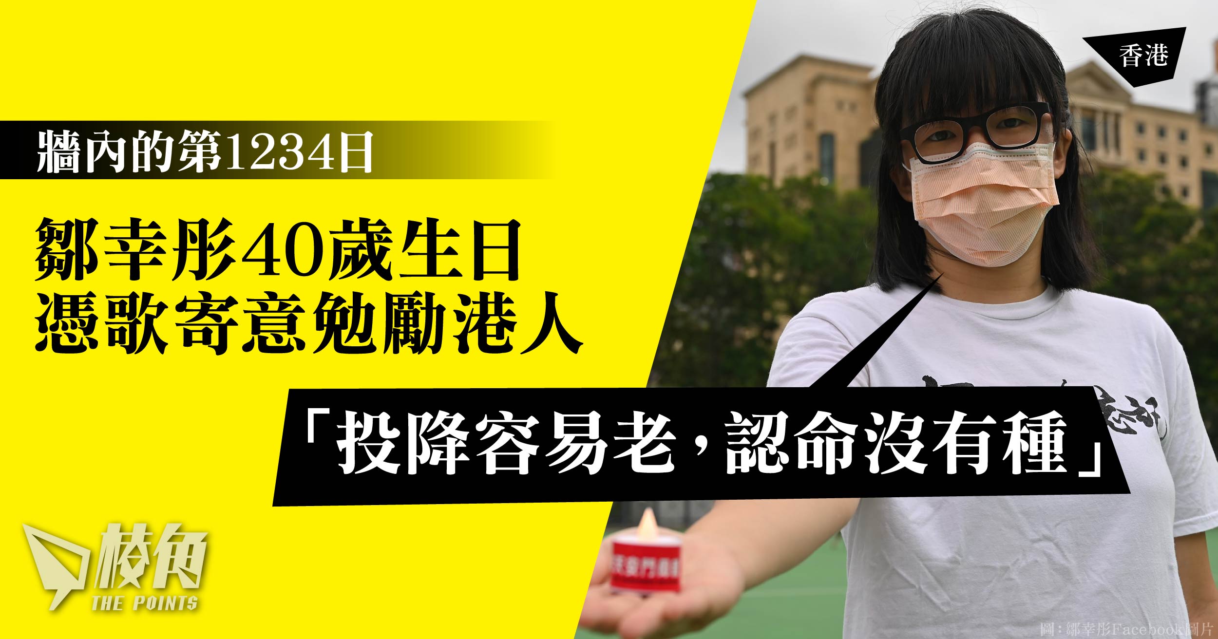 前支聯會副主席鄒幸彤被控違反《國安法》煽動他人顛覆國家政權罪,還押至今已3年4個月,共1234天。周五(24日)是鄒的40歲生日,亦是她在獄中渡過的第4個生日。她透過傳媒撰寫獄中信,以歌手Kiri T的《至少做一件離譜的事》中的一句歌詞:「投降容易老 認命沒有種」勉勵港人。