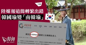 其中,「華夏經緯網」一篇轉載自中評社的評論,標題為《南韓瑜續寫傳奇人生肩負新使命》,不論是內文或標題均使用「南韓瑜」,然而中評社原文以及「華夏經緯網」的簡體版均顯示為韓國瑜。至於「中國網」的報道亦出現類似情況,簡體版能正常顯示韓國瑜,而繁體版就變成了「南韓瑜」。而且「華夏經緯網」數年前的繁體報道亦將韓國瑜顯示成「南韓瑜」,相關文章迄今都未更正。