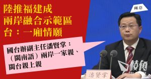 中國日前發佈支持福建省建設「兩岸融合發展示範區」的文件,國務院新聞辦公室今日(9月14日)召開記者會說明政策,當中包括推動在閩台灣人申領居住證、實現大陸身分證與台胞居住證達到同等便利等等。出身福建的國台辦副主任潘賢掌於會上更特意用閩南語,說新政策會令「兩岸一家親、閩台親上親」。而台灣陸委會則發佈新聞稿回應,批評中共試圖以「同等待遇、經濟利益」為掩飾,拉攏誘引台灣民眾、企業接受共產黨的領導,完全是一廂情願的做法。