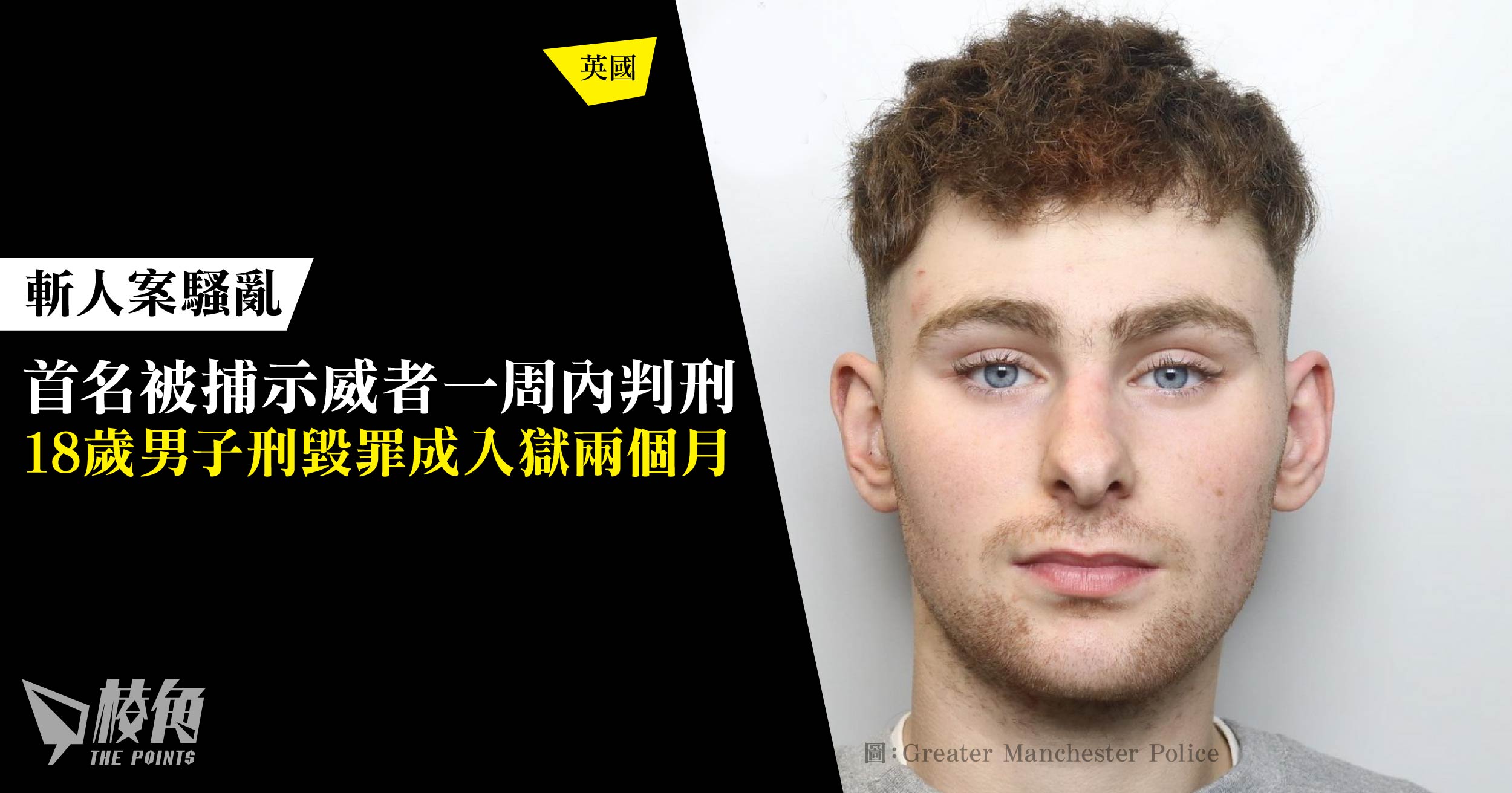 上月尾有人持刀在英國一間舞蹈學校施襲,造成3名女童死亡案,案中英國籍疑兇一度被誤傳為穆斯林移民。事件激發極右分子在多個城市發起針對穆斯林移民及難民示威,暴力升級惡化成騷亂。一名18歲男子於上周日(4日)涉於博爾頓(Bolton)市中心參與示威期間被捕,警方以刑事毀壞罪起訴他,當局安排法庭周二(6日)迅速提堂,法官判他罪成入獄兩個月,是今次騷亂中首位被定罪人士。