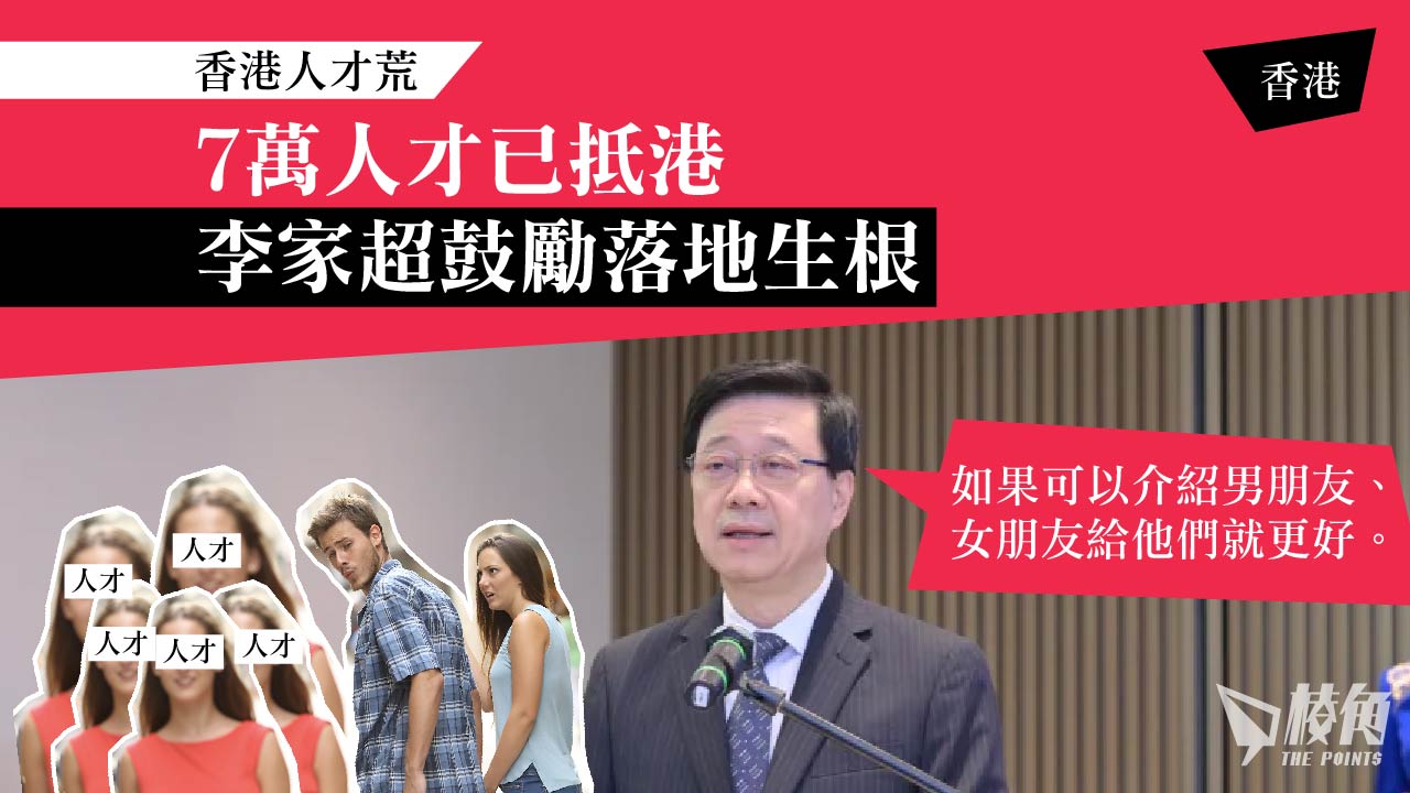 港府近年推各項措拖「搶人才」,行政長官李家超周四(9日)出席活動時公布數據,各項輸入人才計劃共收到超過18萬宗申請,當中逾11萬宗申請已獲批;「高才通」則收到約5.5萬宗申請,超過4.3萬宗獲批,共7萬人已抵港。李家超對數字表示鼓舞,又提出要「留人才」,希望港人向「人才」介紹伴侶,好讓他們落地生根。