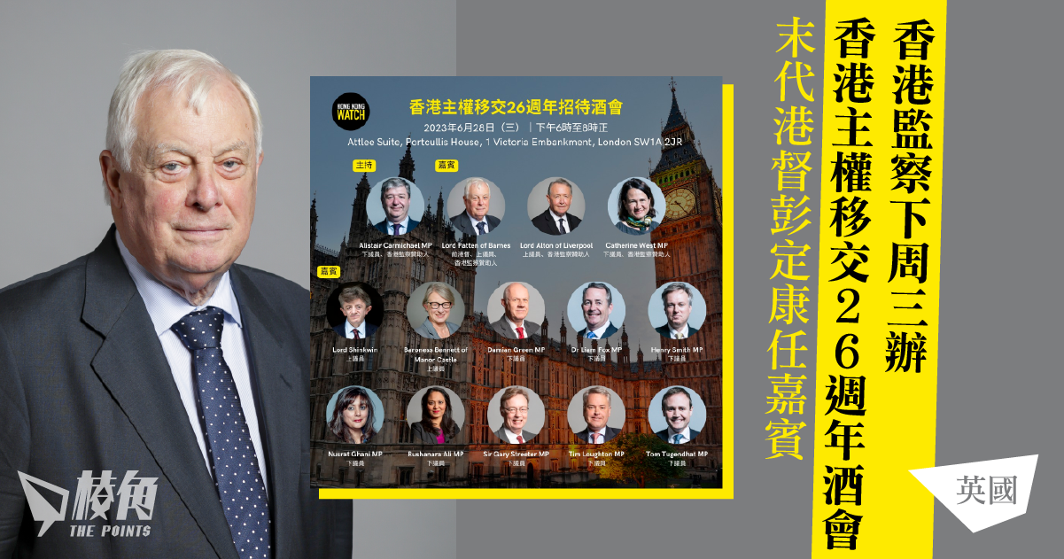 香港監察及Alistair Carmichael MP的主權移交26週年招待酒會將於下周三晚上6時至8時舉行,大會透露邀得多名英國政壇及其他國家代表出席,當中包括 末代港督彭定康、現任安全事務國務大臣董勤達及商業及貿易部國務大臣Nusrat Ghani MP等多名上、下議院議員現身分享。