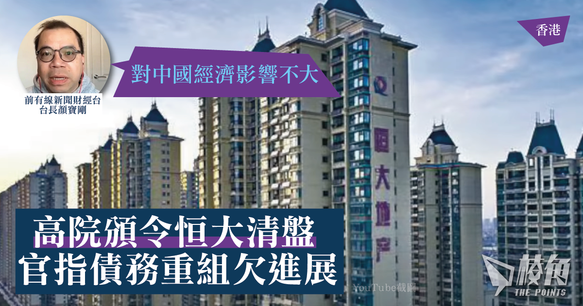 早前有分析指,恒大破產是「雷曼時刻」,前有線財經台台長顏寶剛向《棱角》表示,中國恒大主席許家印早前已因涉嫌違法犯罪被捕,但中央將保交樓的責任交予新的管理層,當局的處理手法,是盡量化解民間百萬名業主的不滿,相信經過多年的化解, 現時恒大接獲清盤令,對中國整體經濟影響不大。不過,他認為恒大清盤不影響集團境內業務是取巧的說法,「當年恒大在香港上市是包括集團內所有上市公司,無分境內外資產,理論上清盤人接管整個恒大集團,但現時內地首要目標是保交樓,因此不排除部分業務由內地市政府接手,境外清盤人要在內地執行清盤令亦有一定難度。」