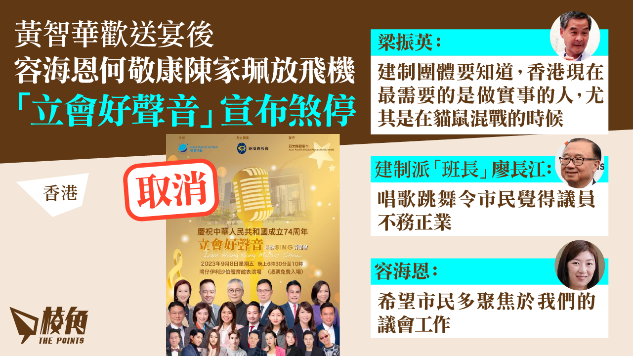 上周多名立法會議員表示,將參與下月舉行的「立會好聲音」音樂會賀國慶。惟黃大仙民政專員黃智華歡送宴後,鋪張排場惹嘩然,全國政協副主席梁振英及建制派「班長」先後批評。周二(29日)有報道指,容海恩連同另兩位黨友何敬康及陳家珮決定退出音樂會,其後主辦單位亦宣布取消活動,表示「現時並非舉行音樂會的合適時間」。