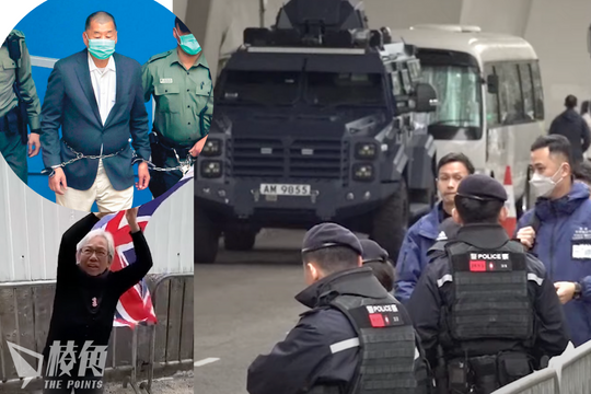 壹傳媒創辦人黎智英涉嫌違反香港國安法「勾結外國勢力」案,今早在西九龍法院開審。警方派出大批警員、警車在通向法院的路向及附近駐守。社運人士「王婆婆」今早8時手持英國國旗到達,一度遭警員包圍,並被帶到法院外示威區。法院外有大批傳媒守候,排隊聽審亦出現人能。民主黨的劉慧卿亦有到場聽審。