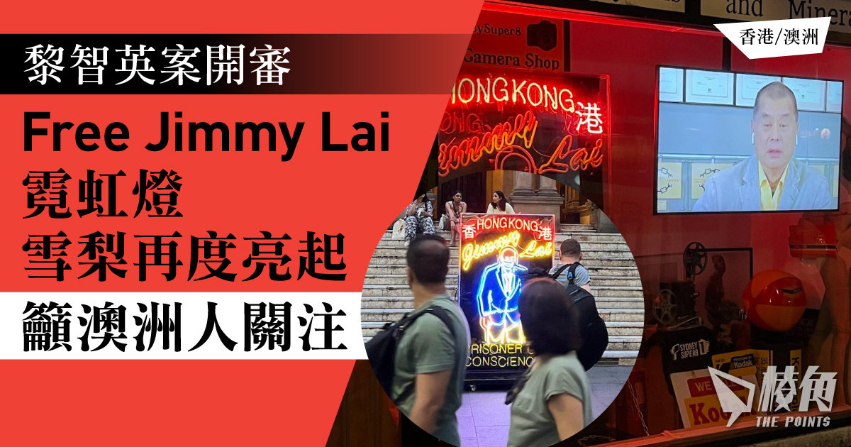 壹傳媒創辦人黎智英及《蘋果日報》3間關連公司,被控串謀勾結外國勢力,周二在西九龍法院續審。澳洲律師Mark Tarrant 為呼籲釋放黎智英的「Free Jimmy Lai」霓虹燈牌,再次在雪梨亮起,希望引起更多澳洲人關注香港良心犯的現況。霓虹燈且會在King St一間攝影藝廊展出,直至明年2月。