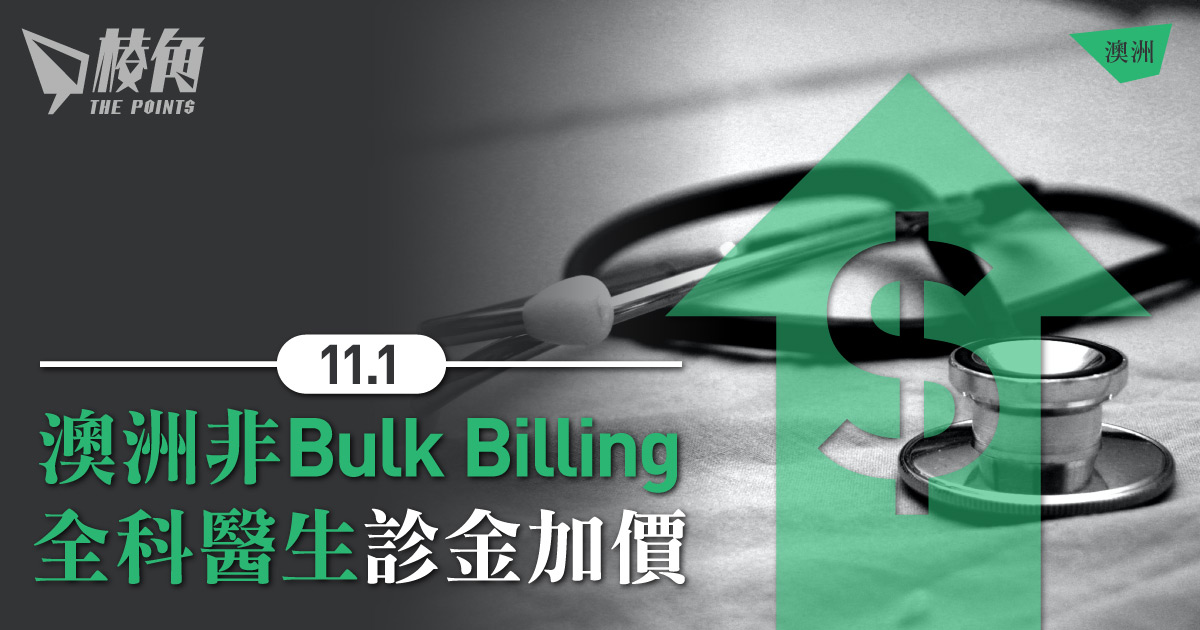 近年生活成本上升,通脹嚴重;政府對Bulk Billing(全額報銷)的付費額追不上通脹,很多診所退出Bulk Billing,市民要睇醫生,無奈要改向非Bulk Billing診所求醫。根據《先驅太陽報》報道,澳洲醫學協會(AMA)建議醫生提高收費,以應對不斷飆升的執業成本。 從11月1日開始,澳人看一次普通的非全額報銷的全科醫生,費用將增加到102澳元。