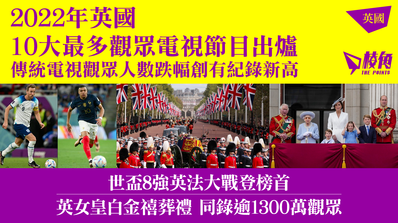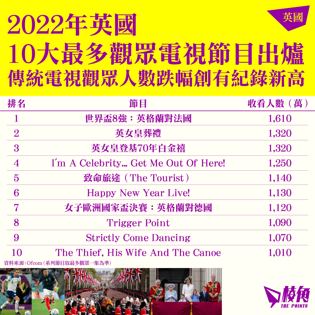 英國通訊管理局(Ofcom)公布2022年英國10大最多觀眾的電視節目,去年世界盃英格蘭對法國的8強大戰以1,610萬觀眾成為榜首,而英女皇葬禮及其登基70年白金禧的直播各錄得約1,320萬觀眾,成為去年第2及第3多人收看的節目。雖然排名前10的節目都錄得逾千萬觀眾,但Ofcom表示受串流服務及網上影片等影響,傳統電視的每周觀看人數由2021年的83%跌至79%,跌幅是有紀錄以來的新高。