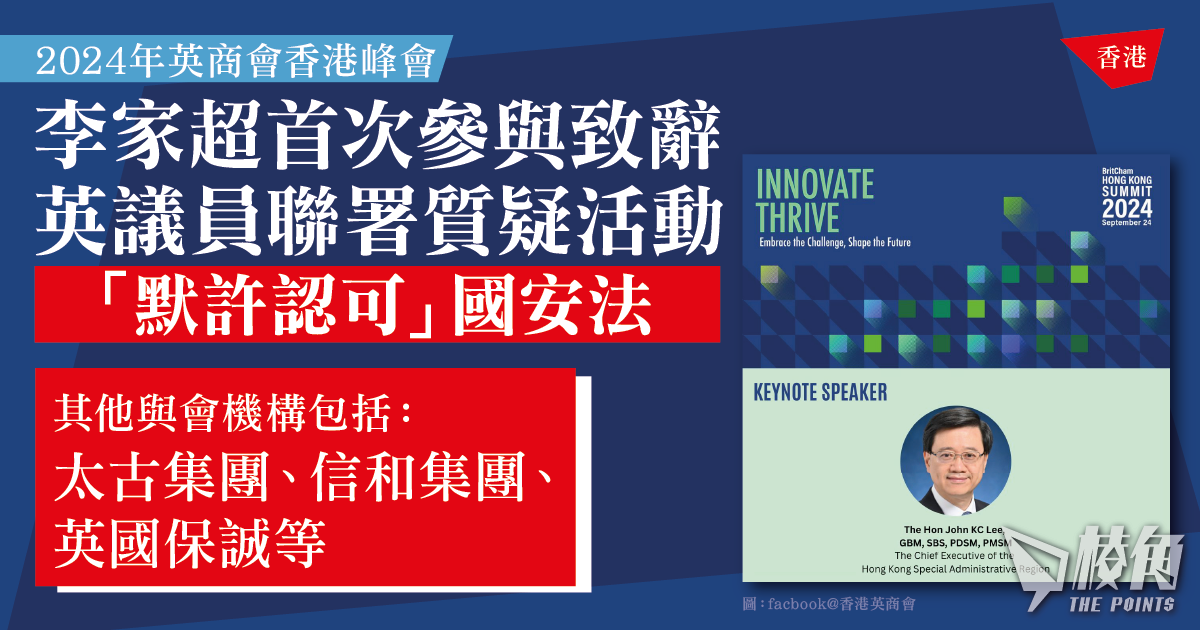 2024年英商會香港峰會(下稱峰會)於周二(24日)舉行,行政長官李家超及中國外交部駐港公署特派員崔建春均首次出席並於會上發言。9名英國上、下議院議員周一聯署致函英國外相林德偉(David Lammy),質疑峰會默許認可兩人監督並實施的國家安全制度,並要求英國更新今年初發布的《海外營商風險指南:香港》,明確指出有機會影響英國企業的《維護國家安全條例》條款。有份出席的其他機構包括太古集團、信和集團、英國保誠等跨國企業。