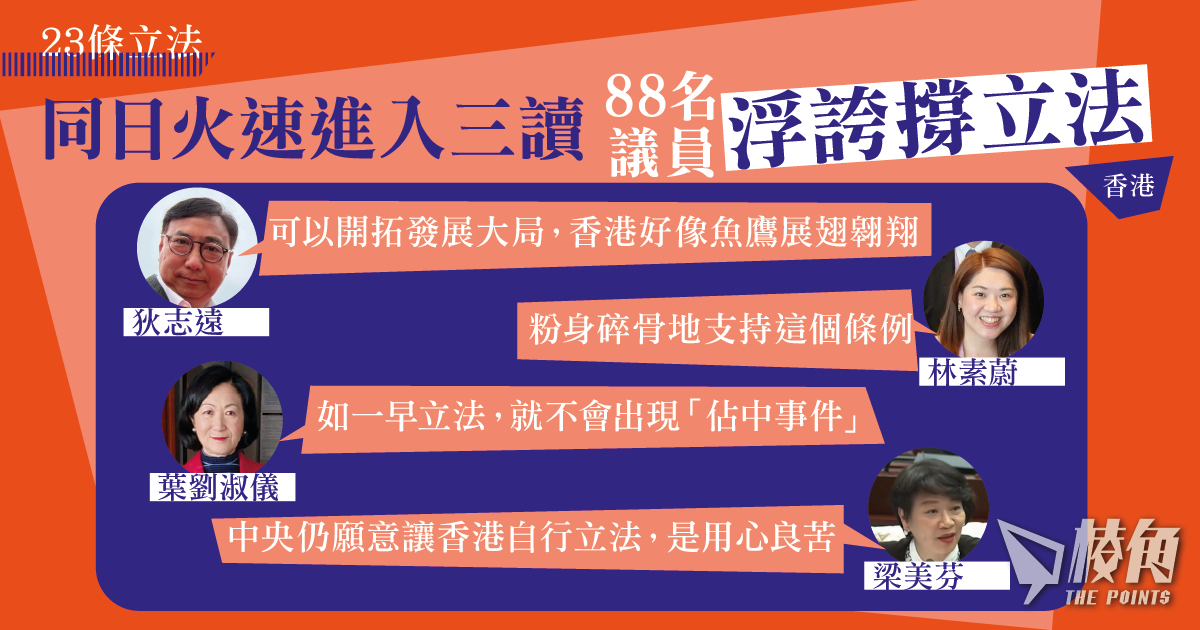 《基本法》23條立法工作火速進行中,立法會周二(19日)加開會議,同日已完成二讀及進入三讀落實《維護國家安全條例草案》。立法會主席梁君彥開會前表明,有信心議員會盡力審議助草案通過,預料會議連踩12小時,將於同日晚上三讀通過。會議早上9時開始,88名議員輪流發言,每人發言約5分鐘,全部齊聲支持立法。