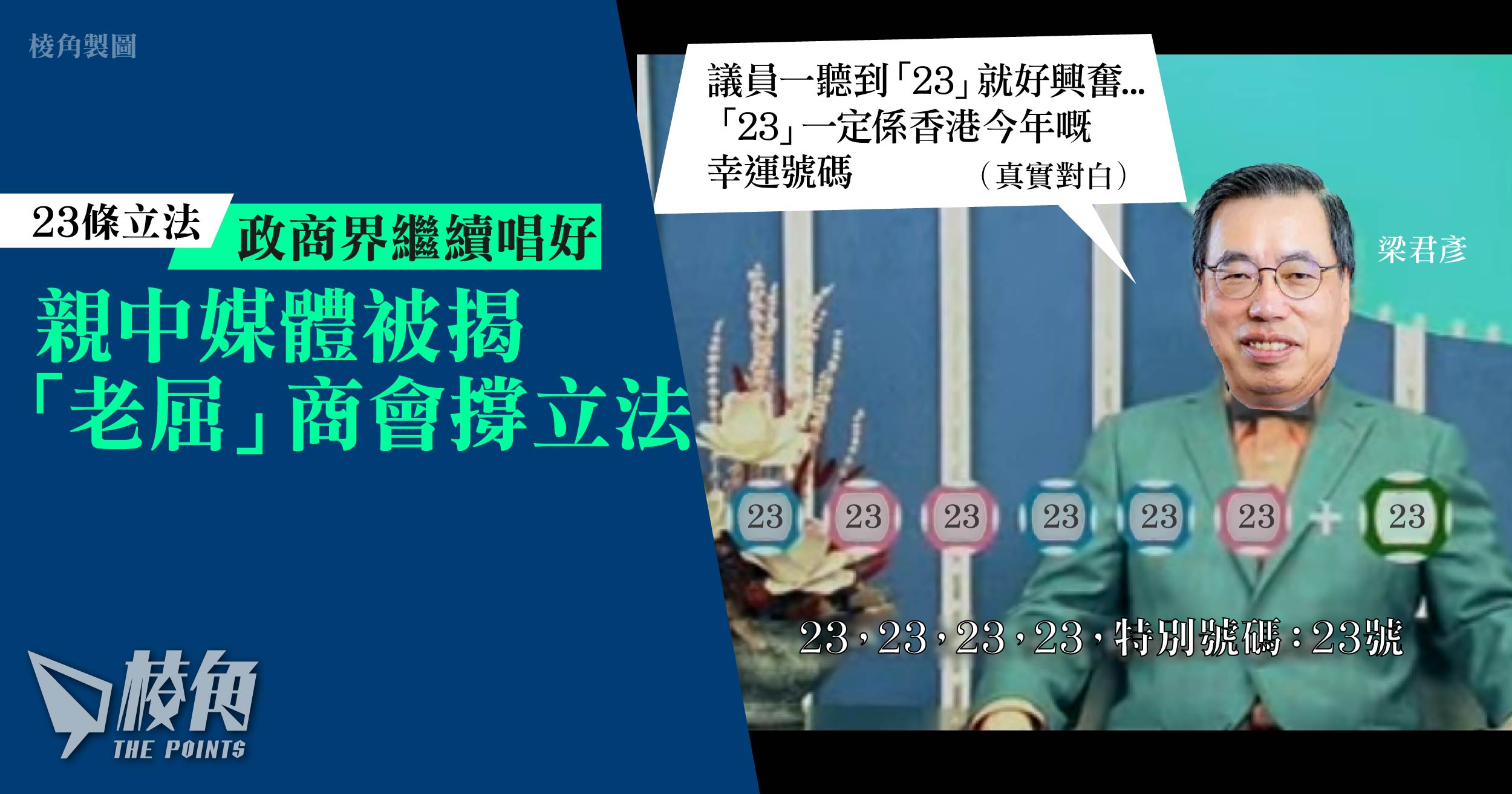 基本法23條立法的公眾諮詢期下周三(28日)結束,各界親政府人士紛紛公開支持立法。立法會主席梁君彥周五(23日)出席立法會新春午宴時表示,「23」是香港的幸運號碼,立法有助香港經濟發展及市民安居樂業。親中報章《大公報》日前引述德國商會支持盡快立法,周五被網媒《reNews》揭發該商會並沒就23條表態,質疑製造「假新聞」。
