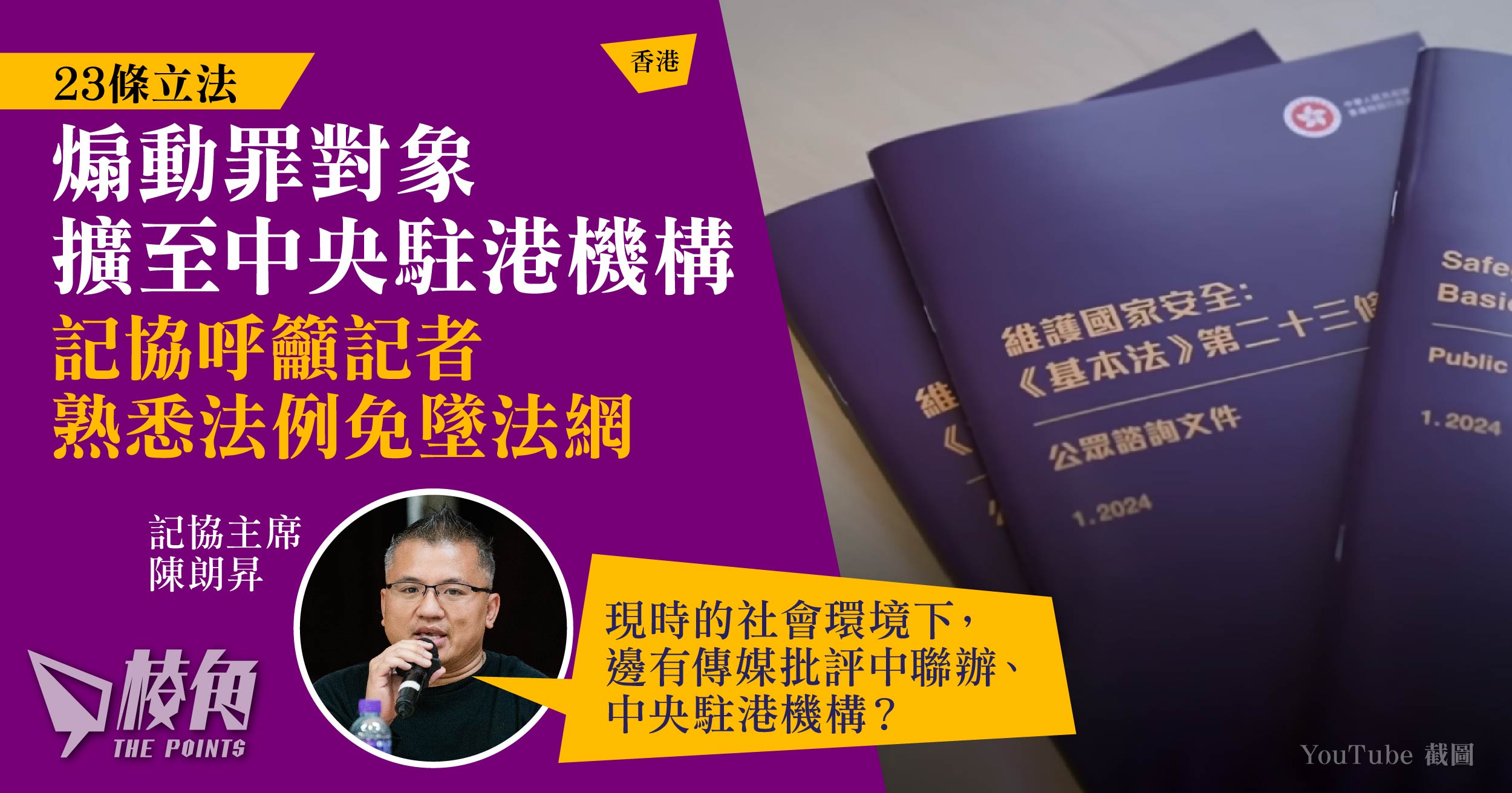 記協主席陳朗昇接受《棱角》訪問時,呼籲記者要熟悉《國安法》及《基本法》23條法例,以免被控煽動,誤墮法網。但他不認為23條立法後對傳媒的威脅會大增,「大家都在《國安法》下,煽動罪一直都有,但在現時的社會環境下,哪裡還有傳媒機構批評中聯辦、中央駐港機構?」