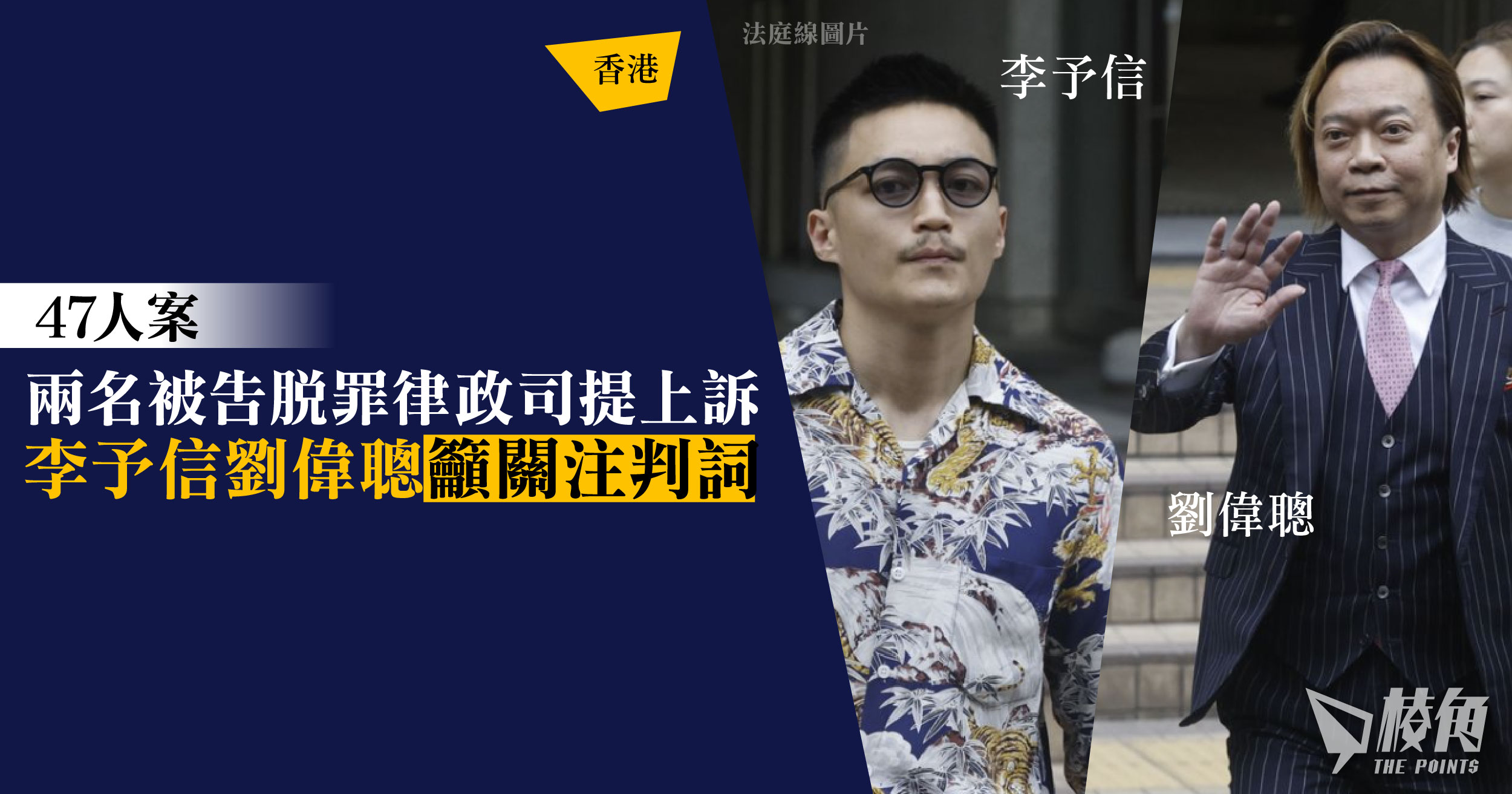 47人案串謀顛覆國家政權案周四(5月30日)於西九龍法院(暫代高等法院)宣判,國安法三名指定法官陳慶偉、陳仲衡及李運騰宣布,除劉偉聰及李予信罪名不成立外,其餘14名不認罪被告罪成。律政司其後正式向法庭申請上訴,二人獲有條件保釋,其餘被告則繼續還柙。