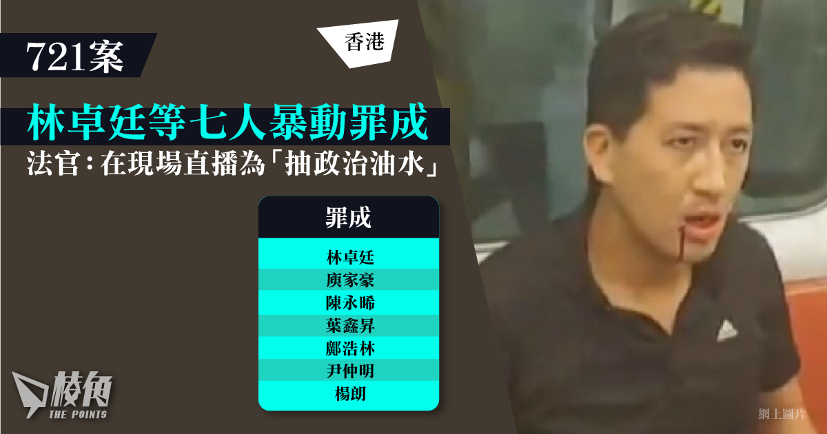 元朗 721事件,7名「非白衣人」被控暴動罪,本周四(12月12日)宣判。前立法會議員林卓廷(45歲)、庾家豪(35歲)、陳永晞(37歲)、葉鑫昇(31歲)、鄺浩林(26歲)、尹仲明(48歲)及楊朗(26歲)全部罪成。法官陳廣池批評林卓廷到現場非為調停衝突,亦非監察警方,而是視乎事態發展「抽政治油水」、打擊敵人。