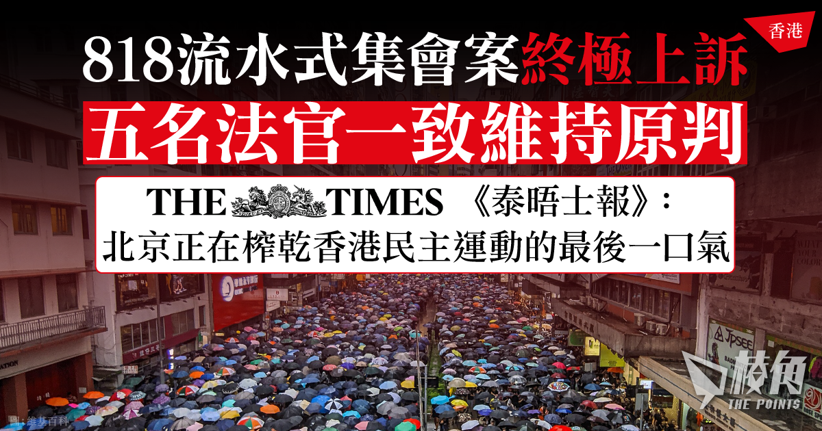 2019年「反修例運動」期間於維園舉行的「818流水式集會」,黎智英、李卓人、吳靄儀、梁國雄、何秀蘭、何俊仁、李柱銘7名民主派人士被裁定組織集結及參與未經批准兩罪成立,7人上訴後獲撤銷「組織集結」一罪,另就「參與集結」定罪上訴至終院,終審法院5名法官周一(12日)一致駁回上訴。案件受國際傳媒關注,其中英國《泰晤士報》於周二(13日)刊登評論,形容案件反映中國及香港政府將國家安全凌駕一切,包括香港的司法獨立及民主精神,「北京正在榨乾香港民主運動的最後一口氣」。