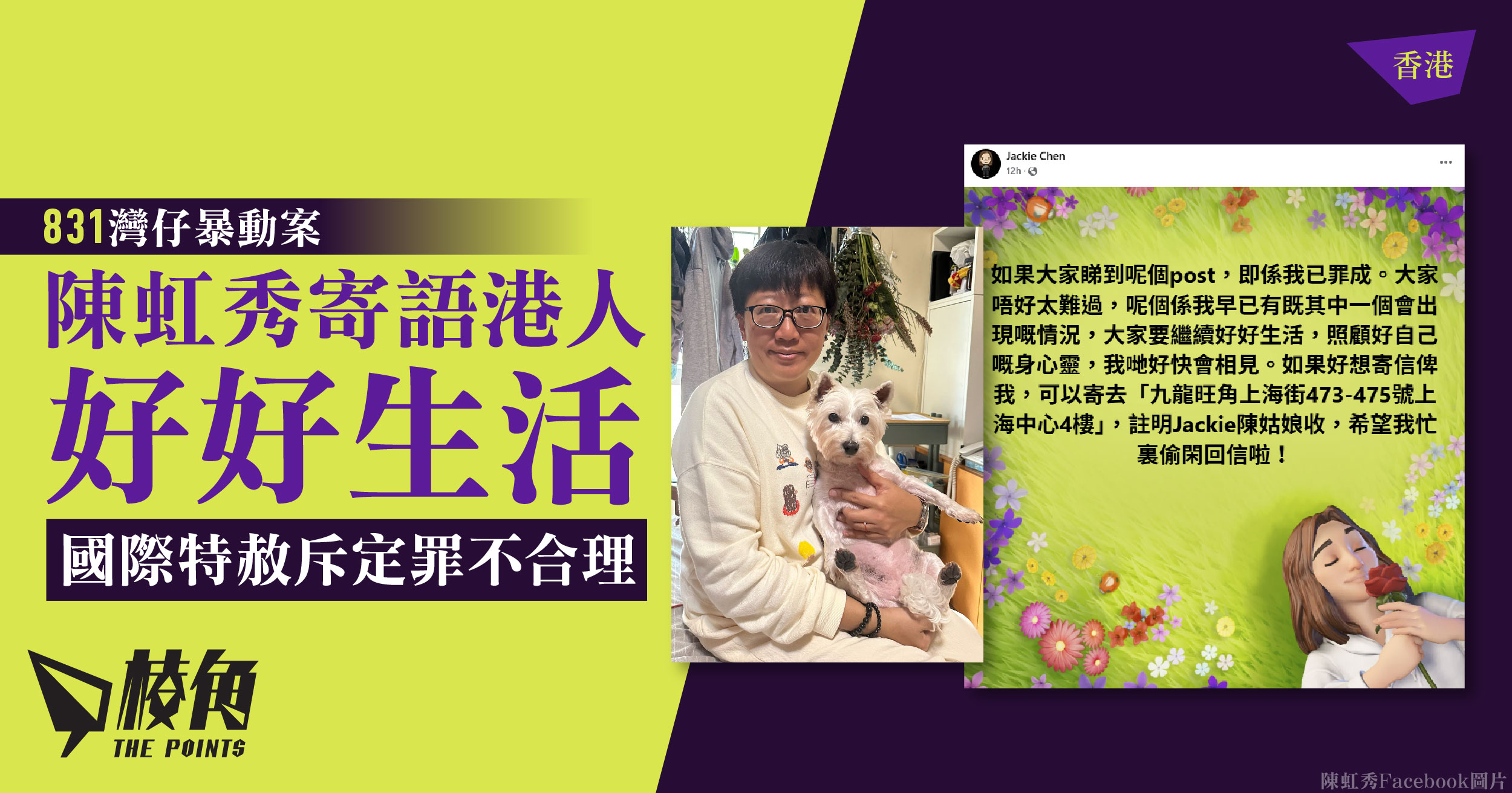 陳虹秀在帖文中暗示,自己在周二上庭前已準備好帖文。她呼籲支持者不用傷心,「呢個係我早已有既其中一個會出現嘅情況,大家要繼續好好生活,照顧好自己嘅身心靈」。帖文附上其社工註冊地址——九龍旺角上海街473-475號上海中心4樓(註明Jackie陳姑娘),表示歡迎大家寫信給她,「希望我忙裏偷閑回信啦!」