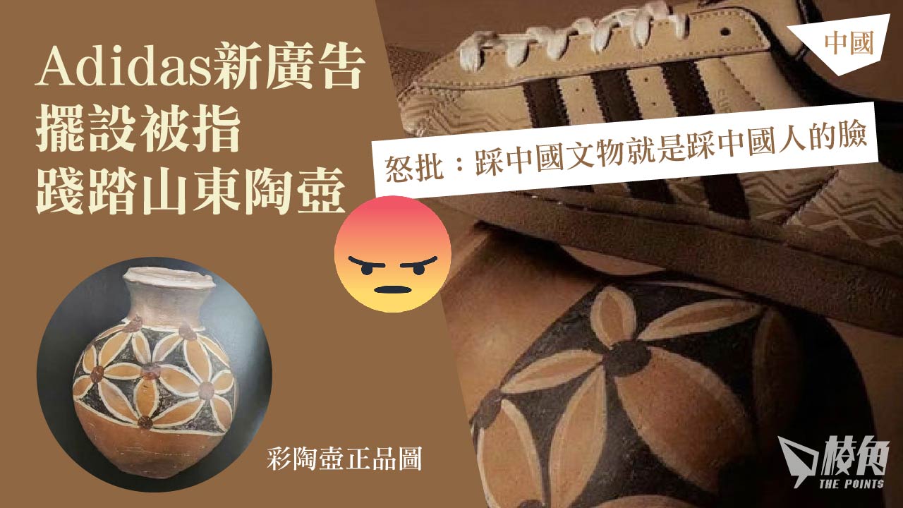 Adidas向中國網民「跪低」。近日Adidas發佈新一季波鞋宣傳照,有中國網民發現宣傳照上的擺設,與山東出土的新石器時代彩陶壺相似,而波鞋則放在擺設上方,質疑Adidas有踐踏中國文物之意。Adidas隨即回應,並將宣傳照下架。
