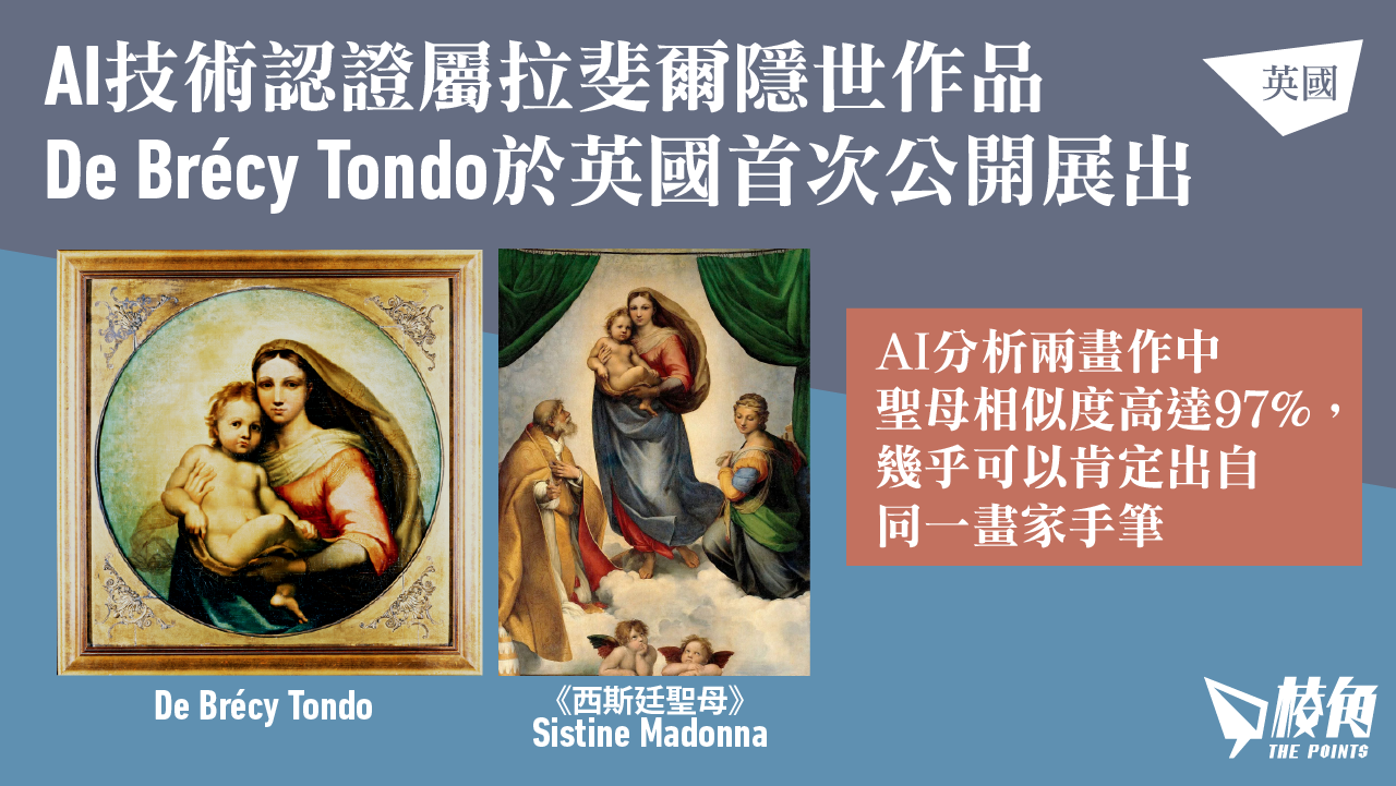 畫作《De Brécy Tondo》出自何人之手一直都眾說紛紜,有人認為它是模仿拉斐爾名作《西斯廷聖母》,亦有人相信它真的出自拉斐爾手筆。這個長達40年的爭論由AI技術於今年初一錘定音,確認該作品確是出自拉斐爾之手。De Brécy Tondo由即日至起9月17日於英國Bradford的Cartwright Hall Art Gallery展出,這次亦是該作品首次向公眾公開展出。