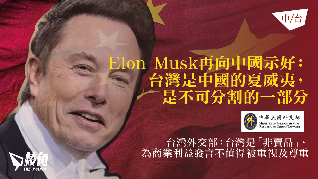 美國電動車特斯拉(Tesla)行政總裁及X公司(前社交平台Twitter)創辦人馬斯克(Elon Musk)繼早前指自己「有點親華」後,再次發表言論向中國示好,形容台灣與中國的關係猶如美國和夏威夷,又指中國將會統領台灣,言論引起關注。台灣外交部反擊,暗諷馬斯克為商業用途出賣自己,強調台灣是「非賣品」。
