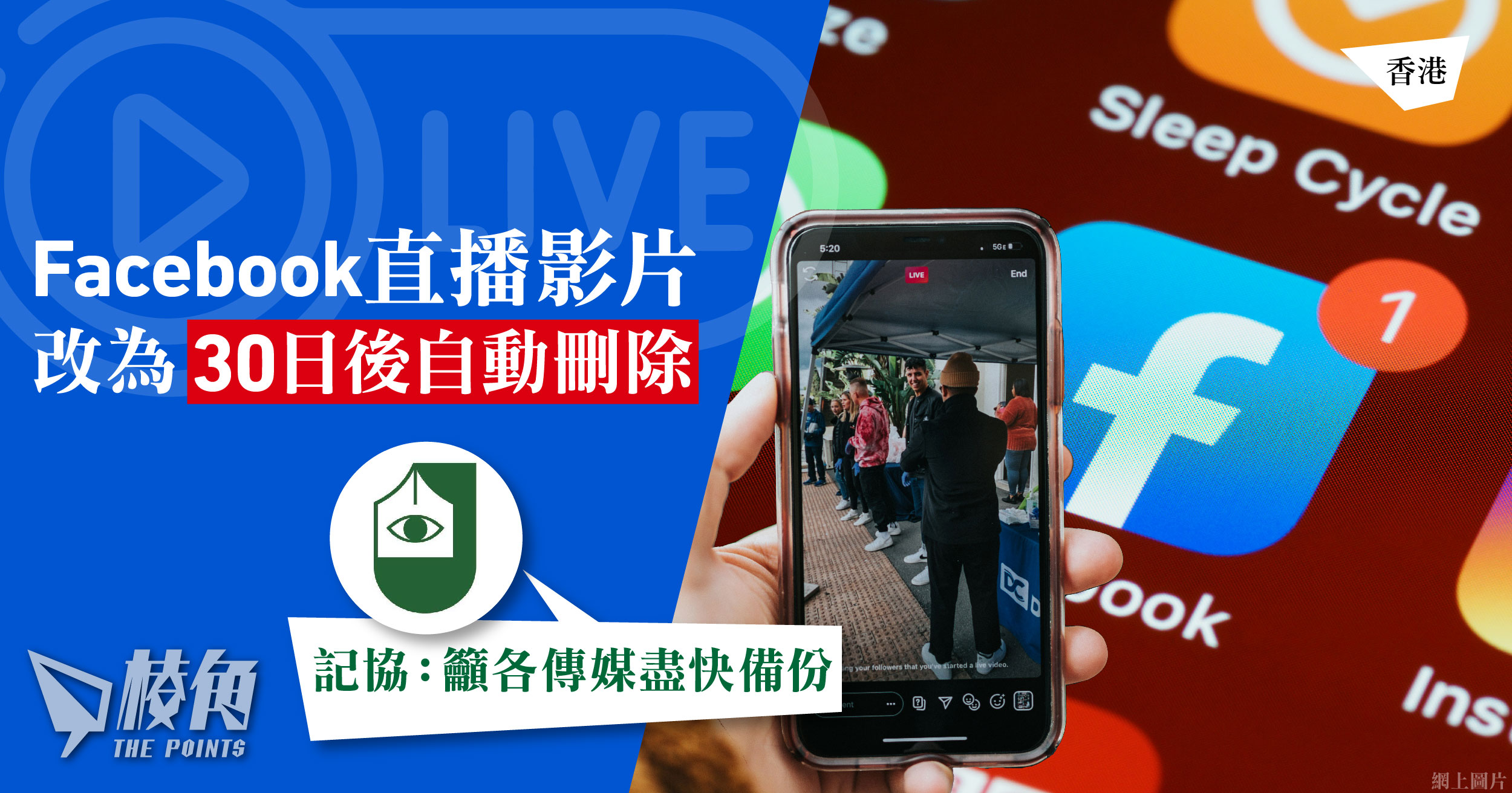 不少傳統新聞機構及網媒不時透過Facebook直播新聞片段,社交平台Facebook母公司Meta周二(18日)宣布,其直播影片將由以往可以無限期保存,改為播出後30天內自動刪除,以配合研發下載直播影片工具。香港記者協會(記協)發文呼籲傳媒盡快備份,或按平台指示申請延長保存限期。