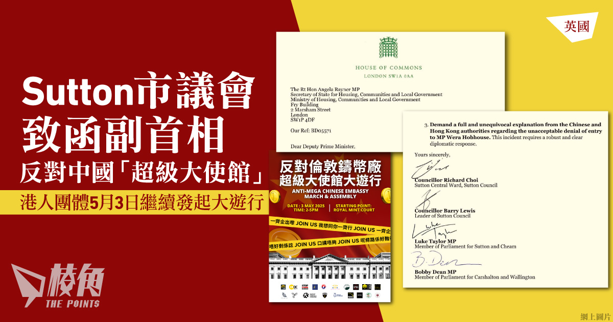 Sutton市議會致函副首相 反對「中國超級大使館」港人團體5月3日繼續發起大遊行