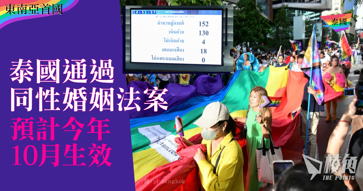 - 泰國通過法案承認同性婚姻,成為東南亞首國
