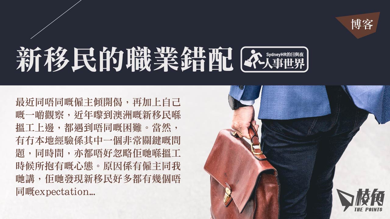 最近同唔同嘅僱主傾開偈,再加上自己嘅一啲觀察,近年嚟到澳洲嘅新移民喺搵工上邊,都遇到唔同嘅困難。當然,有冇本地經驗係其中一個非常關鍵嘅問題,同時間,亦都唔好忽略佢哋喺搵工時候所抱有嘅心態。原因係有僱主同我哋講,佢哋發現新移民好多都有幾個唔同嘅expectation,而呢啲嘅期望,好多時候同現實係會有一段嘅距離。我當然唔係要喺度一竹篙打一船人,呢個係一個對大家嘅提醒,亦都係要注意嘅地方。