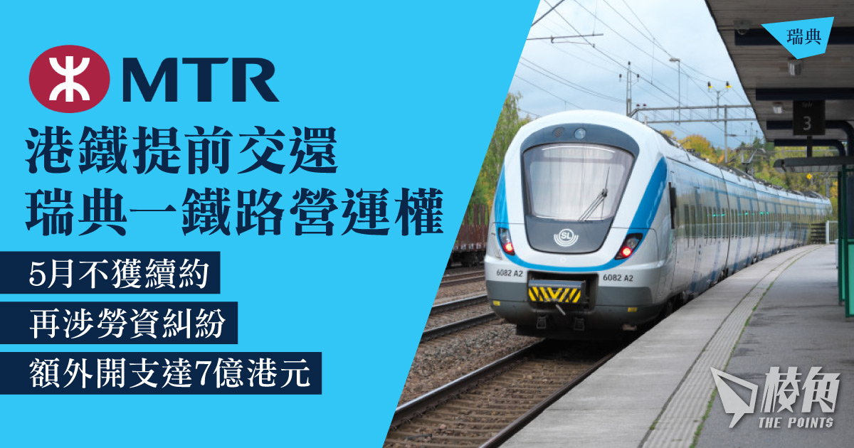 港鐵自2015年起營運瑞典斯德哥爾摩地區的通勤鐵路Pendeltåg,但服務質素一直未如理想,當地政府今年5月決定合約在2026年屆滿後不會續約。港鐵周三表示,基於車長短缺及維修問題等原因令列車服務不穩定,罕有地決定將於明年提前交回該鐵路的營運權,預料將產生約7億港元的額外開支。不過,在瑞典的香港藝術家程展緯早前曾撰文指出,港鐵因取消列車乘務員的職位,與鐵路工會發生勞資糾紛,大量車長其後轉往其他公司工作。