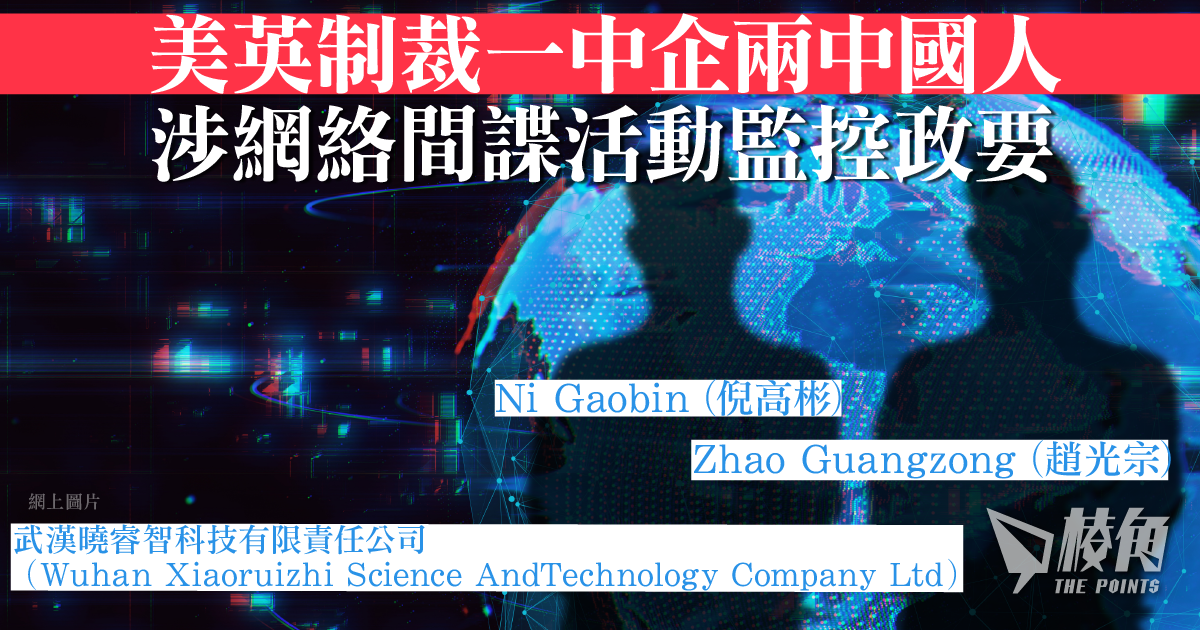 - 美英聯手制裁中國科技公司武漢曉睿智,指其協助湖北省國家安全廳對美英進行黑客攻擊