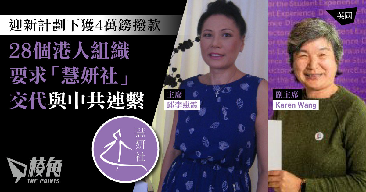 英國政府上月底公布部份根據「香港BN(O)迎新計劃」獲撥款的服務機構名單,婦女組織「慧妍社」為其中一間獲得約 4 萬鎊資助的機構。不過,鑑於有報導指出該社與中共關係密切,包括慶祝中共黨慶。28 個在英港人組織聯署去信,直指相關情況對於應保持政治中立的慈善團體而言實屬不能接受,要求該社公開交代組織及其人員與中共的連繫,並質疑該組織是否可保障港人服務使用者的敏感資料及利益。