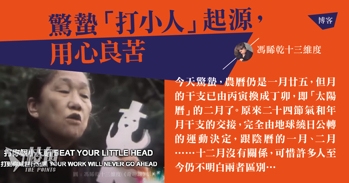 今天驚蟄,農曆仍是一月廿五,但月的干支已由丙寅換成丁卯,即「太陽曆」的二月了。原來二十四節氣和年月干支的交接,完全由地球繞日公轉的運動決定,跟陰曆的一月、二月⋯⋯十二月沒有關係,可惜許多人至今仍不明白兩者區別。