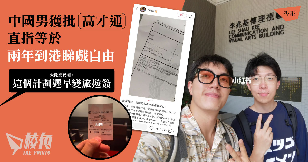 帳戶名為「馬修肖」的中國男子,近日在社交平台「小紅書」發帖表示,獲批高才通後,最期待的是「獲得兩年看電影看展自由」、「以後可以隨時去香港看展看電影」。
