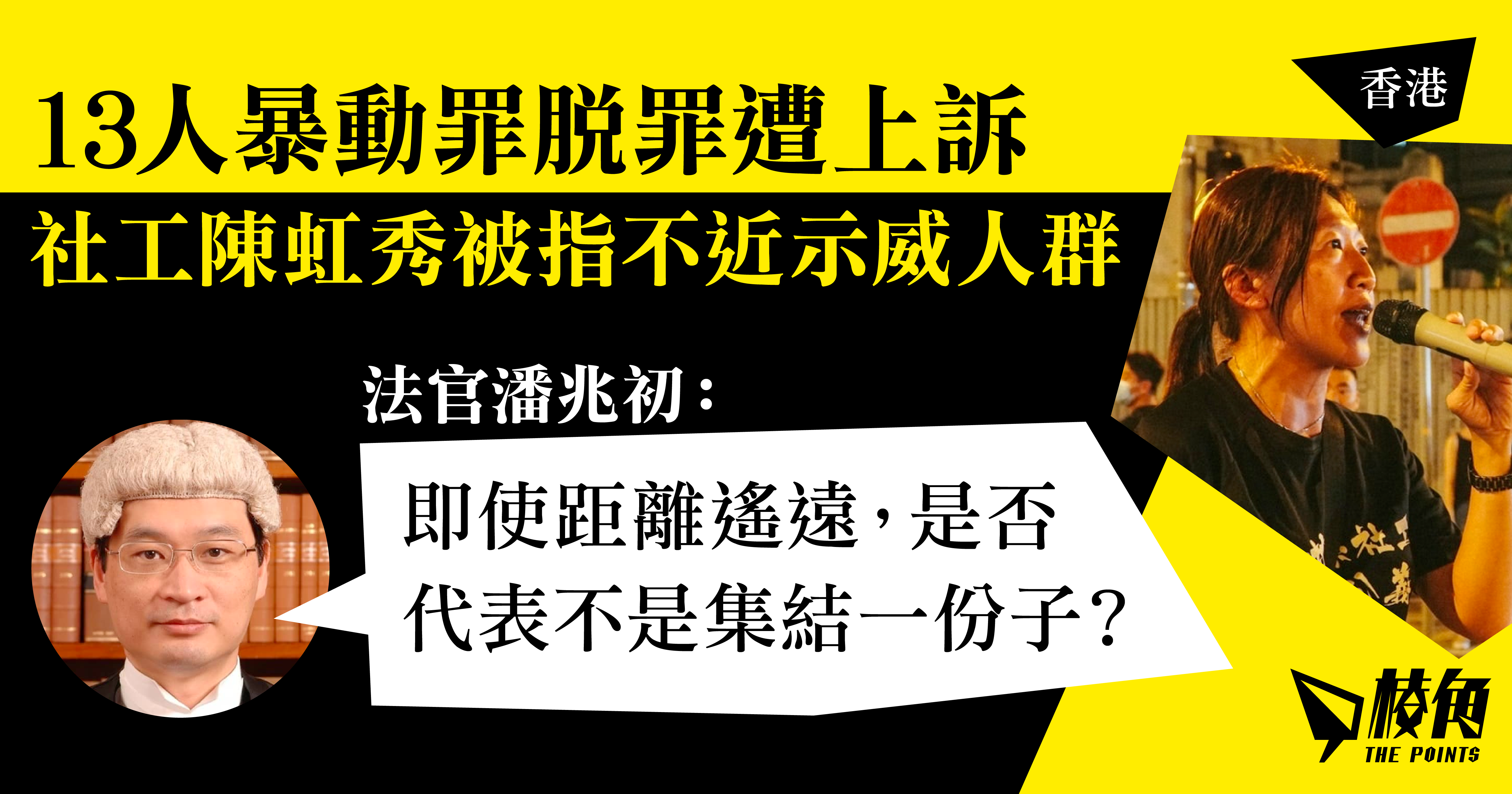 首席法官潘兆初亦反問假設有人用擴音器說鼓勵暴動的說話,即使距離遙遠,是否代表不是集結的一份子?潘熙指,可能構成另一些控罪,但不是暴動罪。