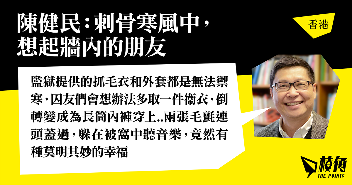 近日本港天氣寒冷,因在2014年發起「佔中」,而被判囚一年多的中大社會學系前副教授陳健民表示:「刺骨寒風中,想起牆內的朋友」。