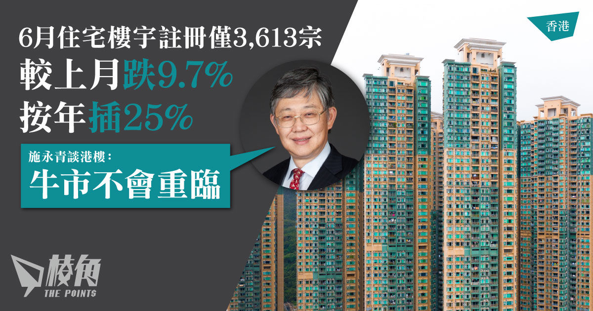 香港土地註冊處周二(7月4日)發表6月份統計數字。住宅樓宇買賣合約佔3,613份,較5月份下跌9.7%,與去年6月比較下跌25.1%;6月份住宅樓宇買賣合約總值336億元,較5月份下跌8.6%,與去年六月比較銳減25.5%。中原創辦人施永青談香港樓市時更直指,「牛市不會重臨」。