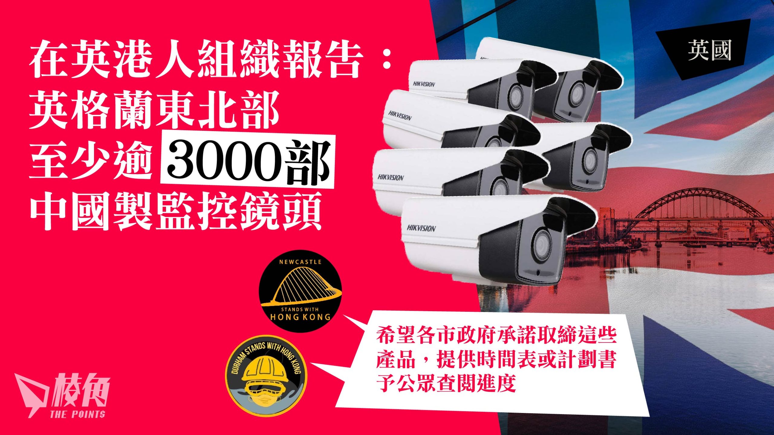 在英港人組織發表調查報告,綜合有關英格蘭東北部地區,各市政府使用中國監控產品的情況,及跟進採購程序及更換產品的進度。組織向12個地區市政府查詢中國監控產品的數量,結果顯示涉及至少逾3000部來自中國監控設備製造商海康威視(Hikvision)及大華科技(Dahua Technology)製造的監控產品。組織發言人向《棱角》表示對結果感到擔憂,希望市政府承諾取締這些產品,並向公眾提供時間表或計劃書。
