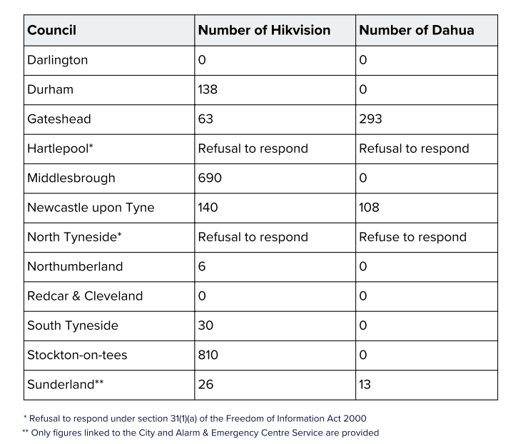 港人組織Durham Stands with Hong Kong (下稱 DSWHK) 和 Newcastle Stands With Hong Kong (下稱NSWHK)早前向英格蘭東北部12區區政府(見圖)就《信息自由法》,提交申請查詢設置在各區,分別來自海康威視及大華科技的監控產品數量。結果發現,海康威視產品數量最多的位於Stockton-on-tees,有810部,其次為Middlesbrough及紐卡素,分別有690部及140;而大華科技產品數量最多的則位於Gateshead及紐卡素,分別有293部及108部。另外,Hartlepool及North Tyneside拒絕提供數據。