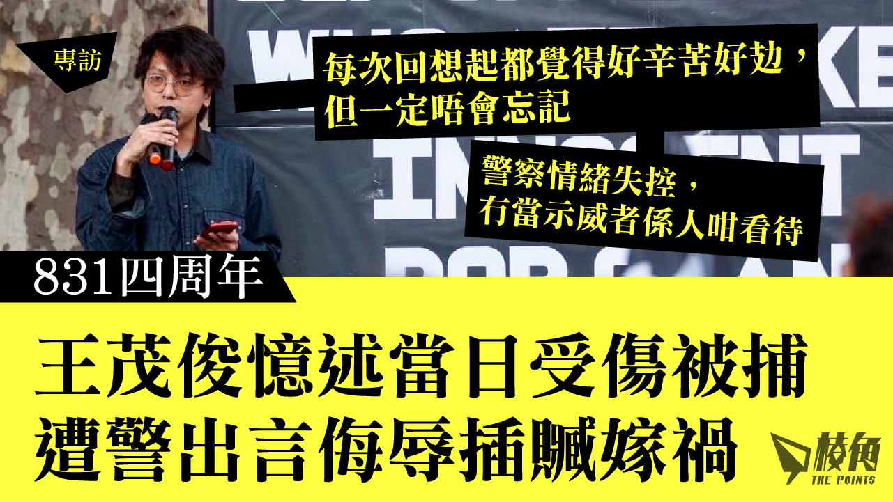 「8.31」太子站警暴事件四周年,當日的站內廣播、武裝警的指嚇聲、乘客的哭泣聲仍在不少港人腦海中迴響著。王茂俊是當日其中一名受傷被捕的人,其後被誤傳為另一名在事件「去世」的示威者「韓寶生」。四年過去,他由一個普通人到現在以難民身份居留英國,《棱角》向他了解當日經歷的種種,再次回憶起被蒙面警追趕及暴力對待的畫面,「雖然回想起都覺得好辛苦好攰,但一定唔會忘記」。
