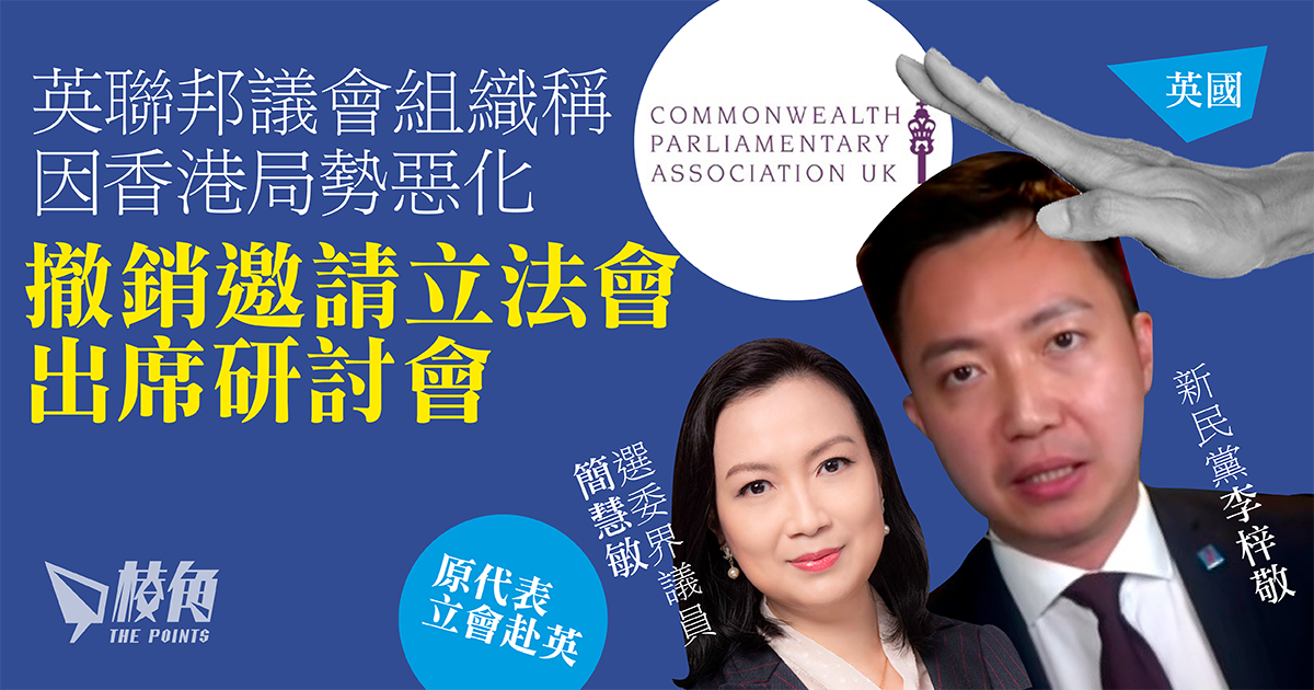 月初有傳媒報道,新民黨李梓敬及中銀總法律顧問、選委界議員簡慧敏,將代表立法會赴英出席英國議會及英聯邦議會聯會(CPA UK)合辦的Westminster Seminar。CPA UK星期四(26日)發聲明,指因香港局勢惡化而撤銷邀請。
