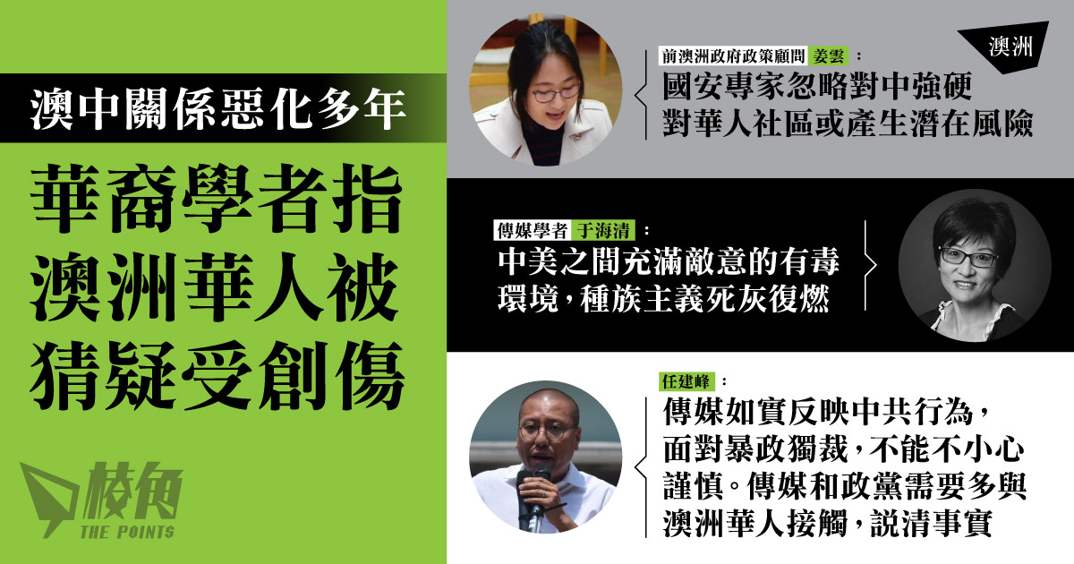 澳洲人口2650萬,華裔佔人口比例5.5%,約140萬人。《衛報》日前報導,受中澳外交關係緊張和敵對言論的影響,很多華裔澳州人感到曾擔心因為血統身分而遭受審視和猜疑。前澳洲政府政策顧問的華裔公民姜雲指出,這已似處於戰爭狀態於戰爭狀態,要華裔被迫作出選擇;國安專家亦忽略了對中強硬,對華人社區或產生潛在風險。學者于海清則批評傳媒報導以及中美之間充滿敵意的有毒環境中,令種族主義死灰復燃。不過,澳洲港人任建峰則認為澳洲傳媒如實反映中共行為,而且大部分持平。只是面暴政獨裁,不能不小心謹慎。他認為媒體和政黨需要多與澳洲華人接觸,對他們說清楚事實。