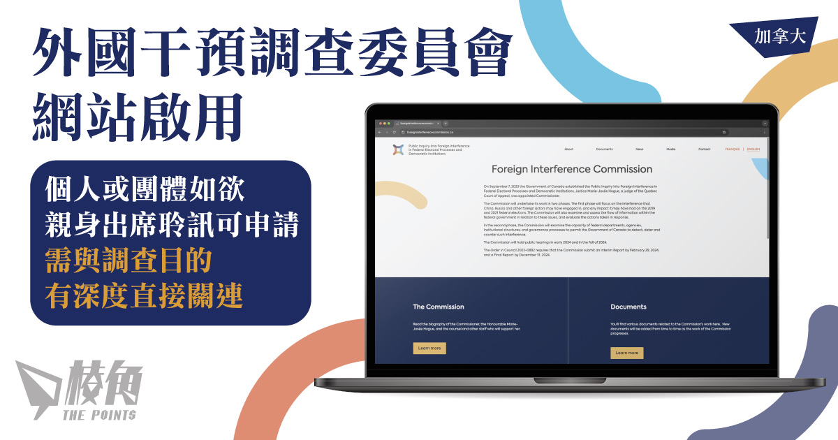 在國會各黨派同意下成立的外國干預調查委員會,其專屬網站上周啟用,並準備於明年1月底先就2019及2021年聯邦大選是否被中、俄等國干預的問題展開公開聆訊。網站已提供申請表格,開始接受來自個人或團體,提出親身出席聆訊的申請。根據相關表格,委員會考慮是否批准讓申請者出席,主要視申請者是否與調查目的有深度直接關連,及是否對調查有必要的貢獻。申請截止日期為本月22日。